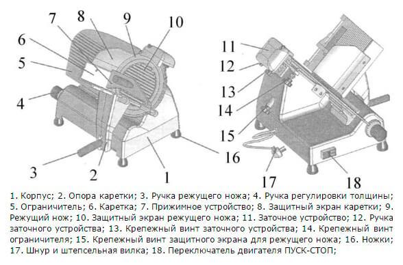 Работа с профисиональным слайсером не вызовет особых проблем даже даже у начинающего повара. Продукт помещается на каретку и выстанавливается желаемая толщина слайса. и после включения оборудования каретка подается к вращающему ножуи отводится обратно (в автоматическом слайсере подача каретки осуществляется благодаря двигателю.).