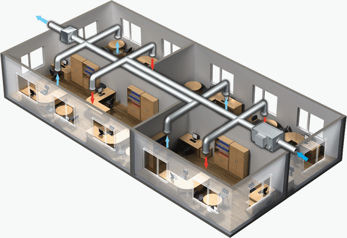 • В современном офисе организовать приточно-вытяжную вентиляцию можно на следующем примере. В коридоре за подвесным потолком монтируется приточная установкаМПА, вытяжной вентилятор (соответствующий характеристикам приточной установки), приточные и вытяжные магистральные воздуховоды. В помещения кабинетов прокладываются ответвления и устанавливаются воздухораспределительные устройства.