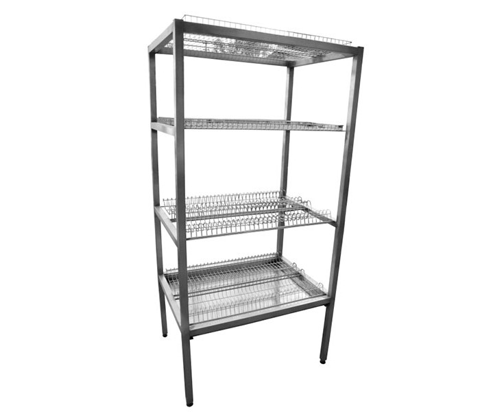 - Это оборудование относится к разряду универсальных, поскольку его конструкция очень проста. Сборка не займет много времени, а готовое изделие с легкостью впишется в интерьер любой кухни. При этом он очень вместителен, как правило, на нем можно свободно разместить несколько партий посуды из посудомоечной машины.