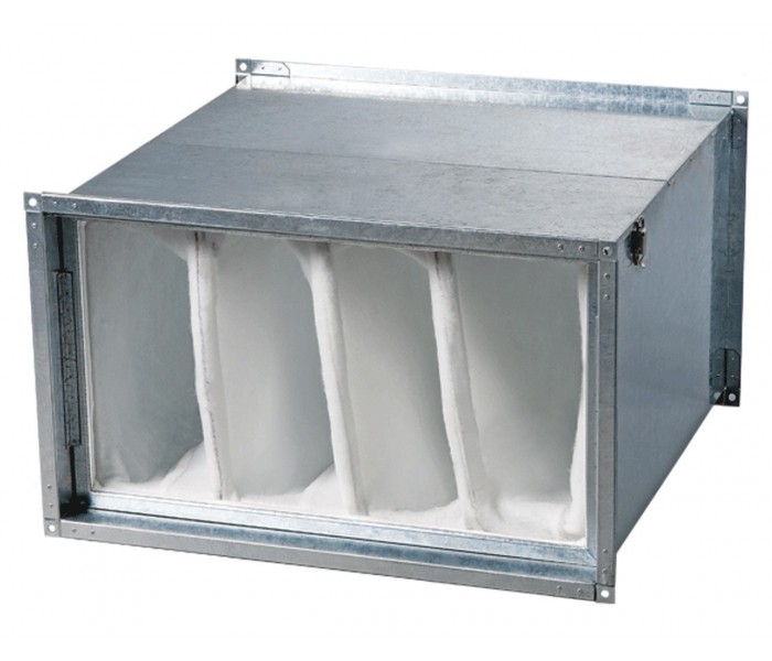 Кишенькові повітряні фільтри застосовуються для очищення припливного, а в ряді випадків і витяжного повітря в системах вентиляції та кондиціювання прямокутного перерізу. Служать для захисту повітроводів, теплообмінників, вентиляторів, приладів автоматики та іншого вентиляційного обладнання від запилення. Зводять до мінімуму забруднення стін та стель біля повітророзподільних пристроїв. Фільтри грубого очищення можуть застосовуватися як перший ступінь очищення перед більш ефективними фільтрами. | Корпус виготовлений із оцинкованої сталі. Відкидна кришка фільтра обладнана замками важеля для швидкого доступу до змінного фільтруючого елемента. Фільтруючий елемент кишенькового типу виготовлений із нетканого полотна із синтетичних волокон та зафіксований на каркасі із сталевої рамки. |