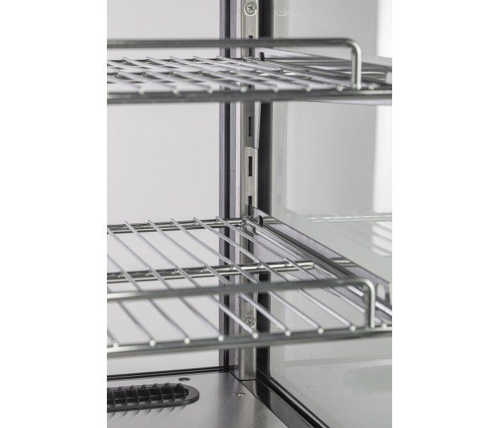 - Оптимальна температура: Ефективна система охолодження забезпечує постійну та оптимальну температуру всередині вітрини, що сприяє тривалому збереженню свіжості продуктів.